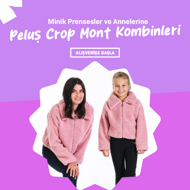 Anne Kız Kombin Pudra Peluş Fermuarlı Astarlı Crop Mont