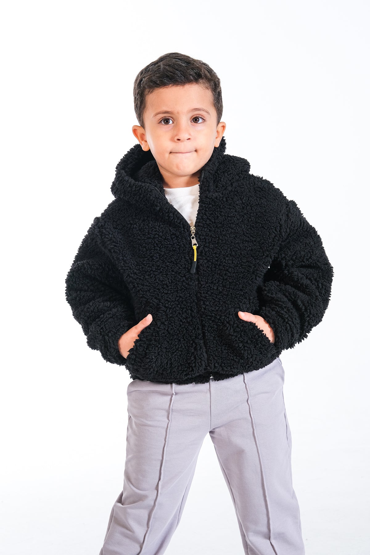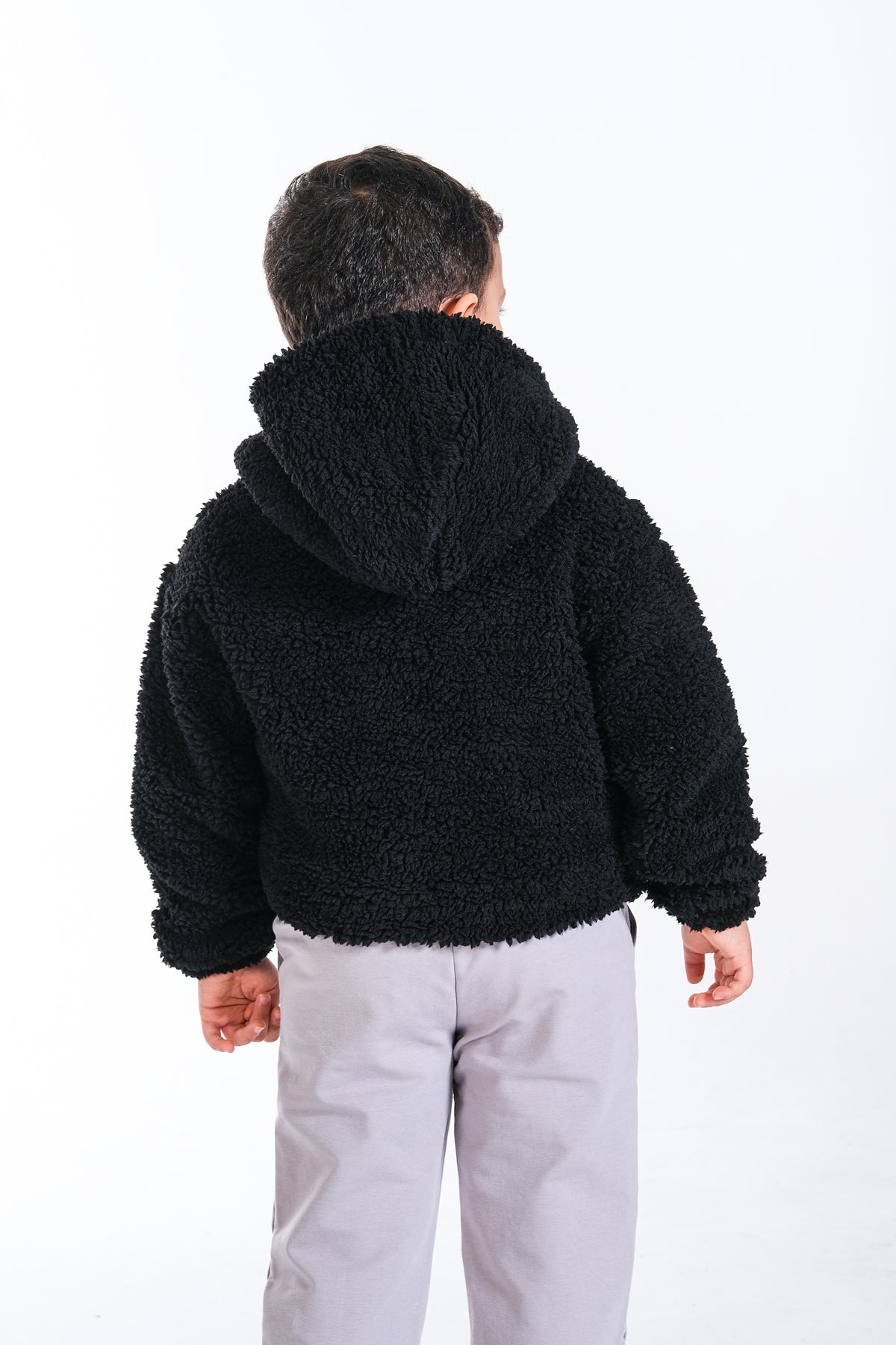 Yumuşacık peluş dokusuyla sıcaklık ve konfor sunan bu erkek çocuk mont, soğuk havalara karşı ideal bir koruma sağlar.