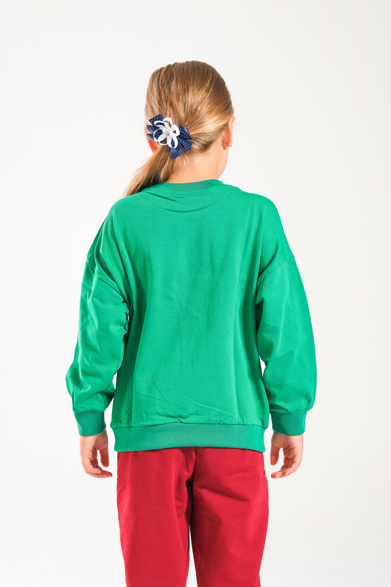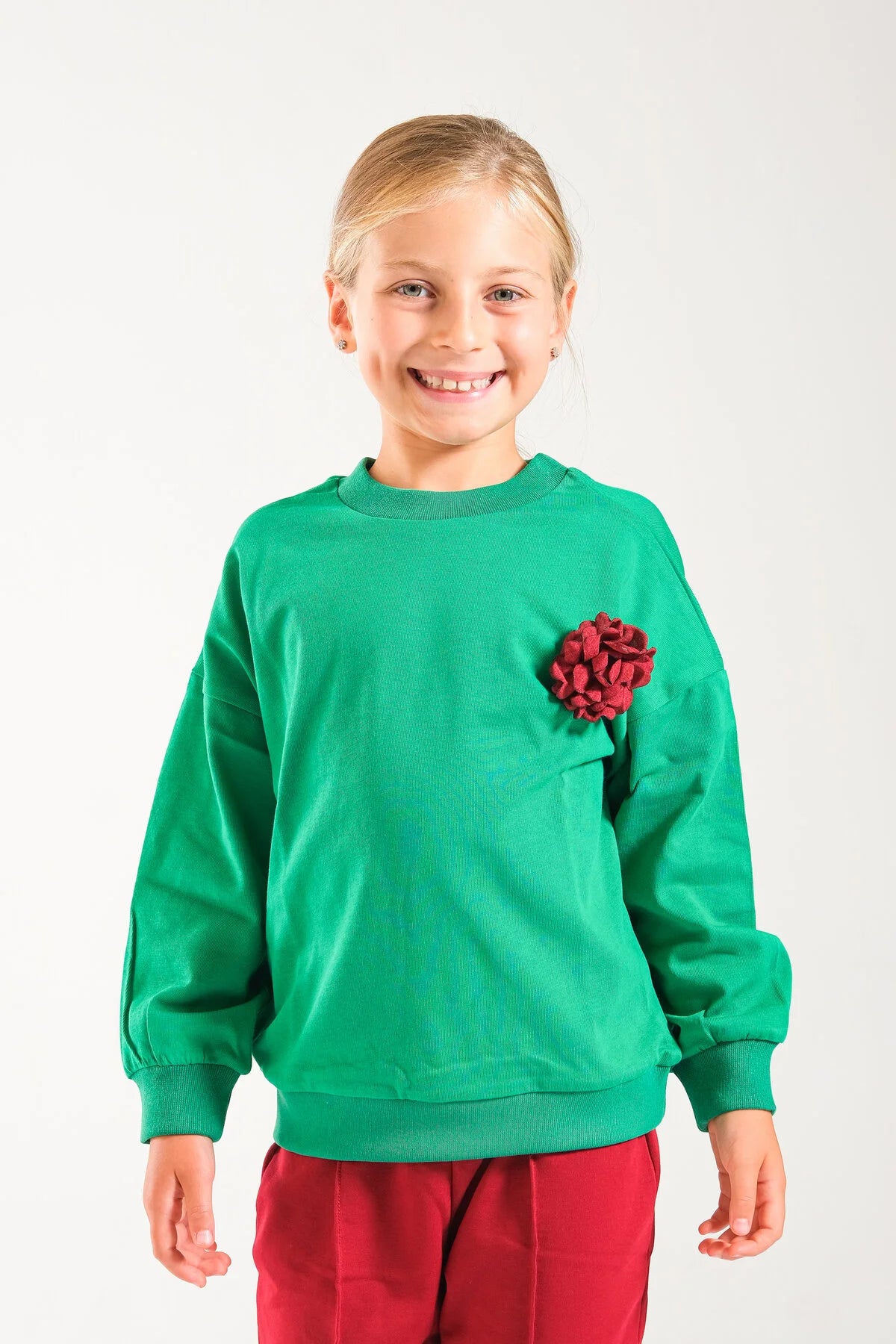 Kız Çocuk %100 Pamuk Oversize Sweat Ve Likralı İki İplik Çima Detaylı Pantolon Takımı - Yeşil-Bordo