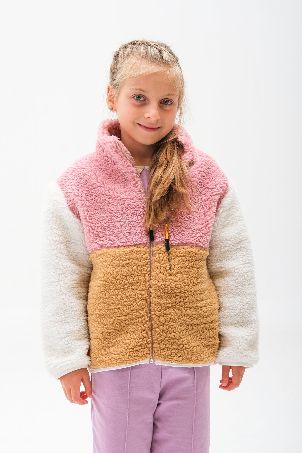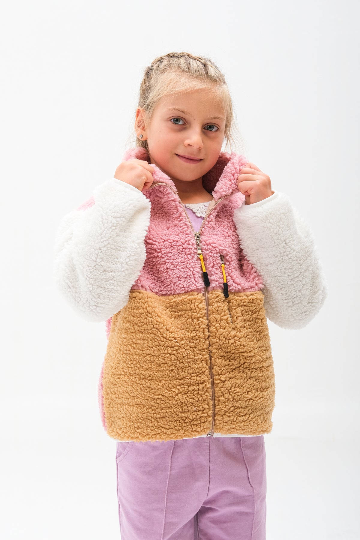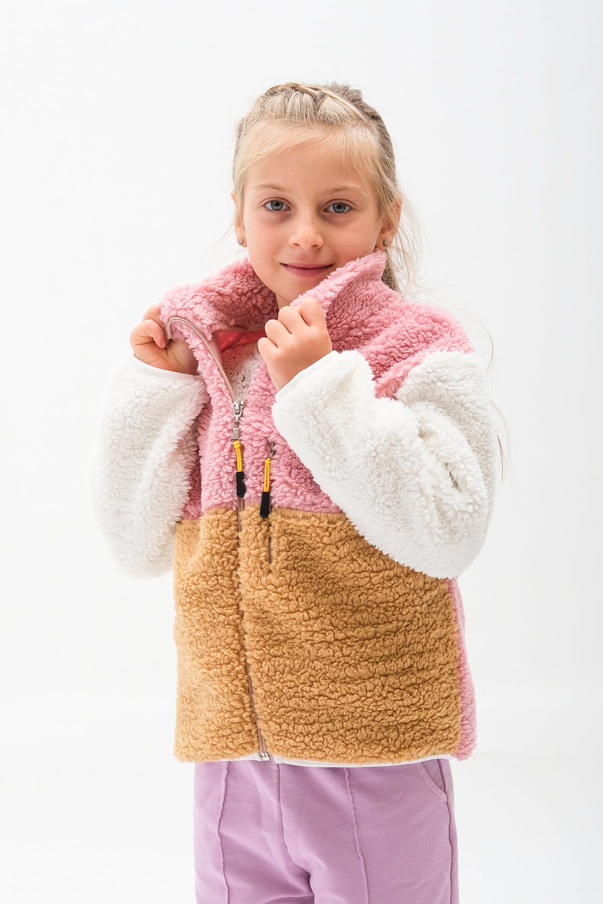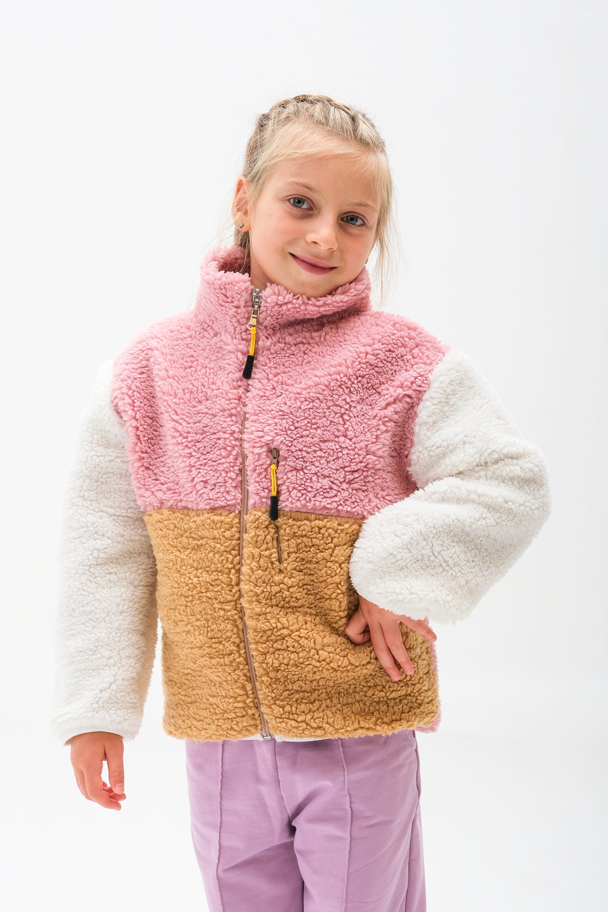 Kız Çocuk Fermuarlı Peluş Hırka - Bej-Pembe-Ekru